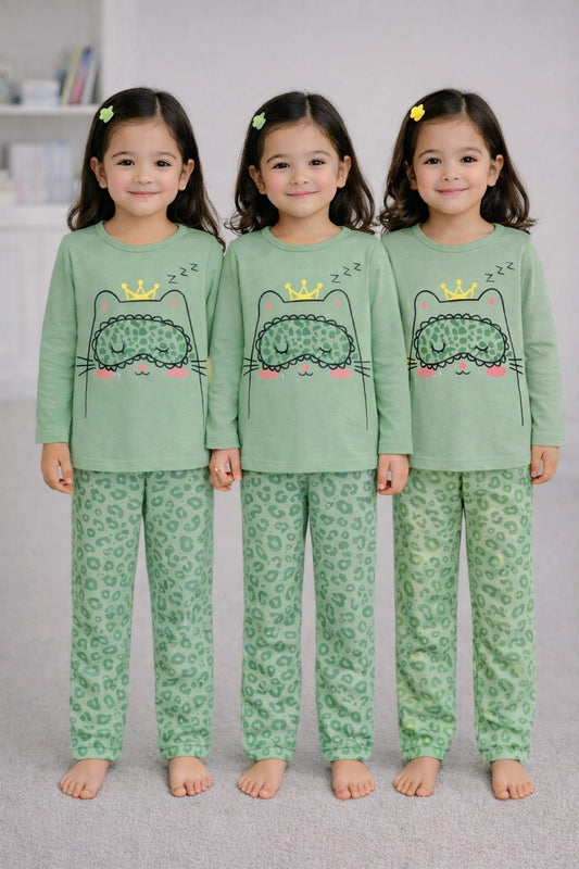 Cute Kitty Dreams Kids Pajama Set- Green