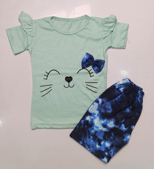 Cute Kitty Bow Girls 2-Piece Summer Set – Mint Green Top & Blue Tie-Dye Shorts