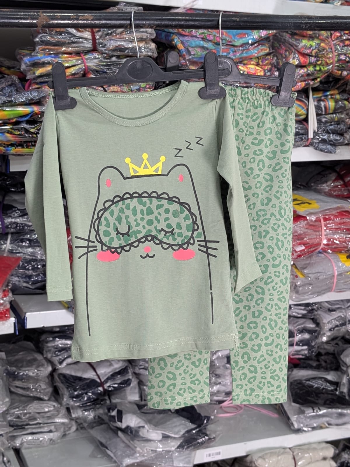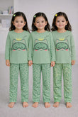 Comfort meets cuteness in the Sleepy Kitty Girls 2-Piece Lounge Set! This adorable outfit features a soft olive green long-sleeve top with a sweet sleepy cat print and matching leopard print leggings for a trendy yet cozy look.