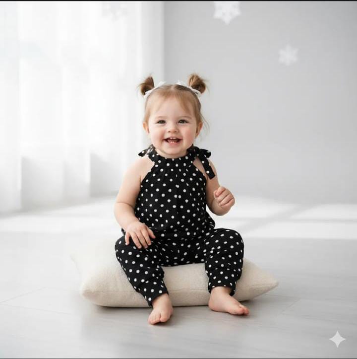 Our Classic Polka Dot Jumpsuit is designed for comfort, cuteness, and everyday adventures. Featuring a charming polka dot pattern and a modern sleeveless design, this outfit is perfect for playful days, parties, and casual outings.