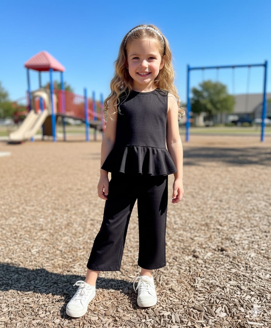 The sleeveless peplum top adds a trendy touch, while the wide-leg pants provide flexibility and ease of movement — making it both stylish and practical for active kids.